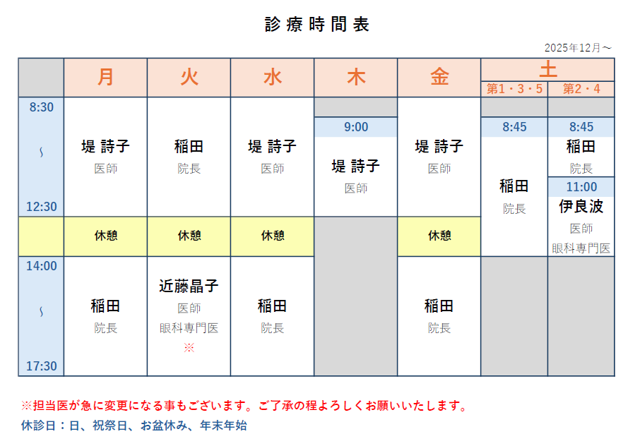 ・診療担当医師: 稲田晃一朗(眼科診療経験46年)、堤詩子(眼科診療経験14年)