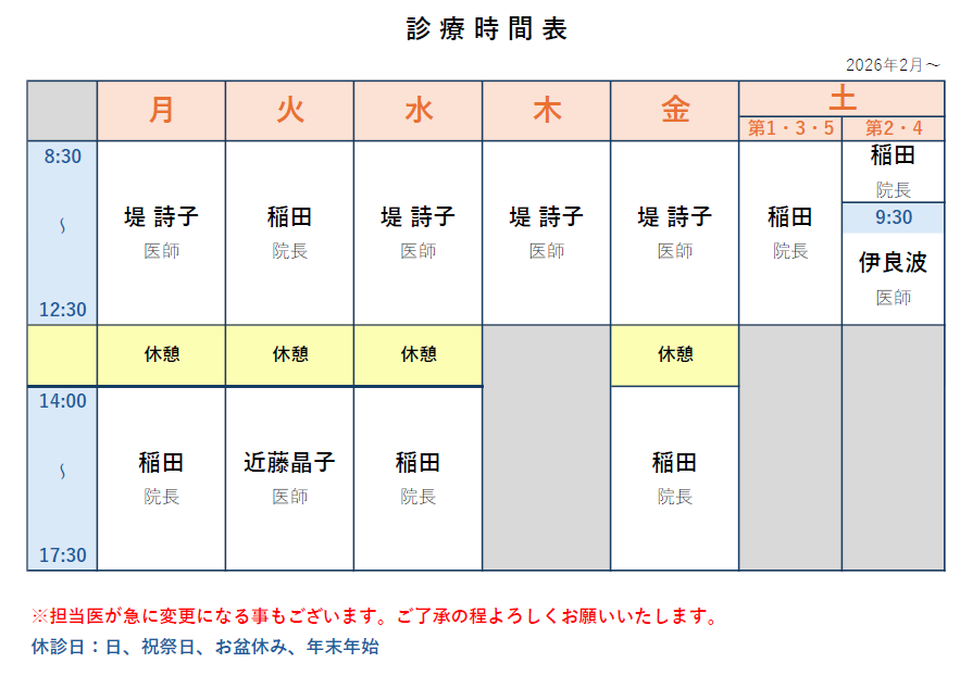 【木】9:00〜12:30、午後休診【土】8:45〜14:00と定めております。